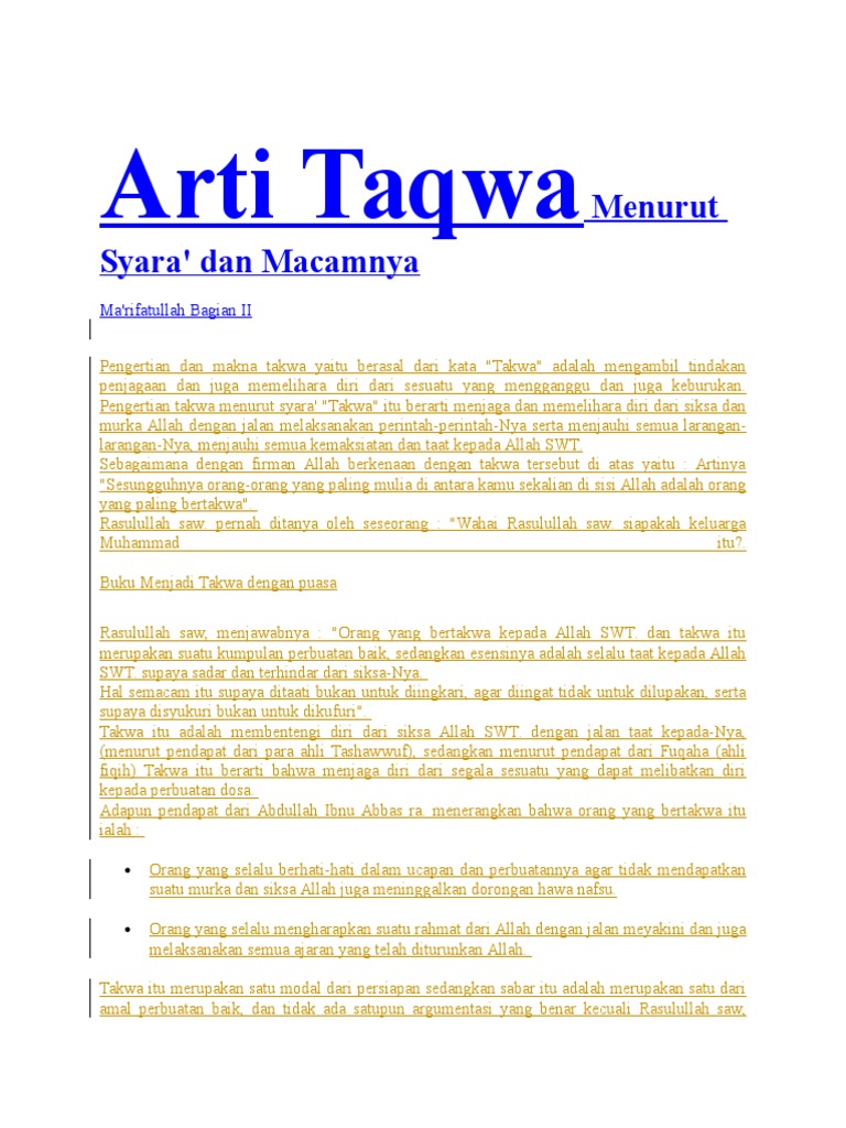 Taqwa Bahasa Arab. Seperti yang tertulis dalam firman Allah Swt di QSAl Baqarah. Bahawa takwa itu ialah menjauhkan setiap apa yang ditakuti akan membawa mudarat kepada.